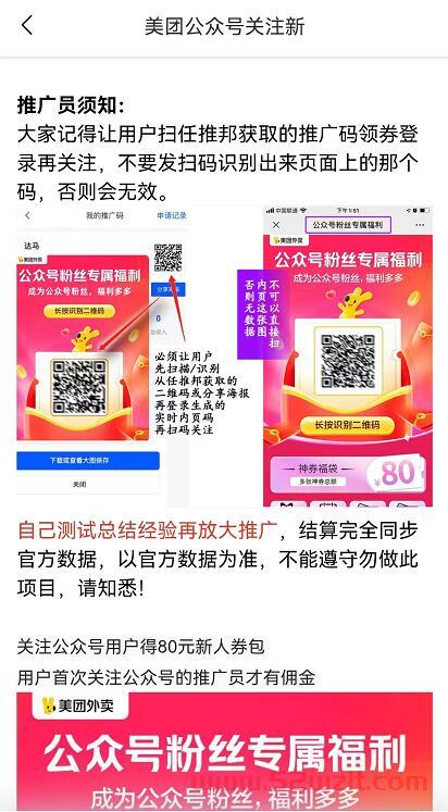 美团公众号推广关注领优惠券一单多少钱?说起美团公众号关注这个项目,相信很多网友并不陌生,实际上去年年底就有过一波类似的活动,不限制美团新老用户,只需要推广用户扫码进群点一下领优惠券券就可以获得佣金,自然是特别的火爆的一直持续了3月!