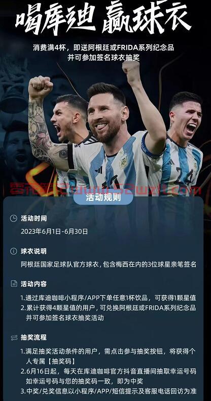 如果你想获得球王梅西亲笔签名,那么不妨关注一下库迪咖啡,只要我们在6月30日前喝够4杯咖啡,即可获得梅西球衣抽奖资格,哪怕你对足球不感兴趣或者并非梅西的球迷甚至你是C罗球迷,但只要知道这是很有收藏和投资价格就行了,说实话梅西亲笔签名的球衣在国内保守可以卖出万元以上(大家了解下,阿根廷对澳大利亚的票价和热卖程度,以及和梅西拍照资格就得20万售价起步,可想而知梅西的球衣会有多值钱,比任何大羊毛都要给力太多了)