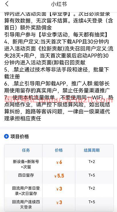 这个项目操作还是很简单的,不过需要注意不能有任务量,所谓任务量就是给钱别人注册软件或者通过悬赏平台放单等方式,这样的推广渠道活跃度很低用户质量差,是不会结算的!