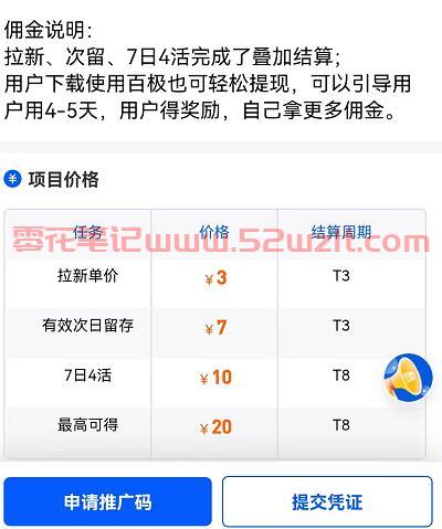 如果想在价格上有优势可以用任推邦内部的金牌账户邀请码12345678注册一下,就能成为平台一级代理,我们在首页【热门】板块就能看到百度极速版哦,申请报备就能开始作业了,目前百度极速版推广佣金有3个板块,拉新+次留+七天4留。